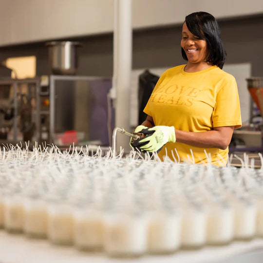Everything we produce is hand-poured in small batches by women survivors who are paid a living wage, provided a strong benefits package, and a healthy work environment.